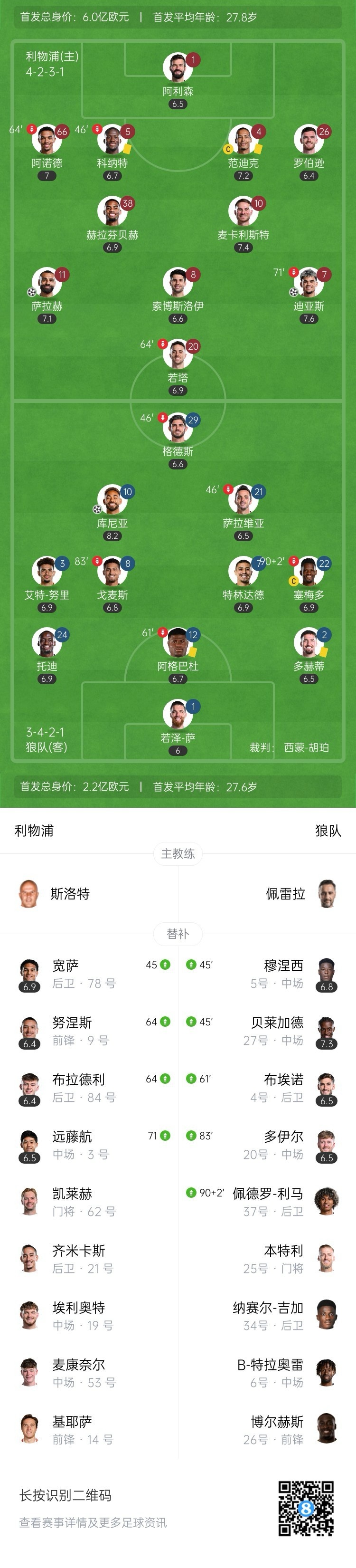 半场战罢,利物浦暂2-0狼队。