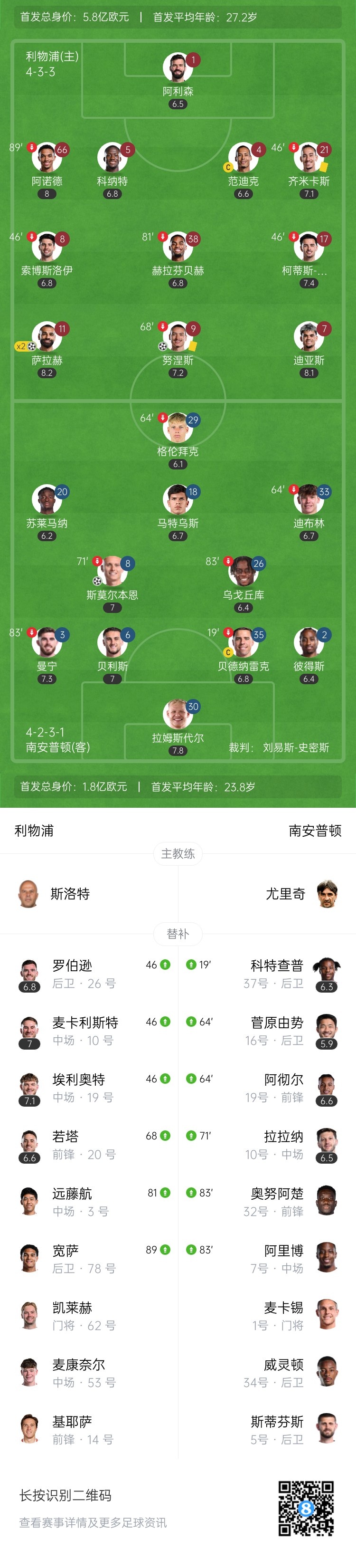 下半场伤停补时7分钟,全场比赛结束,最终利物浦3-1逆转南安普顿。