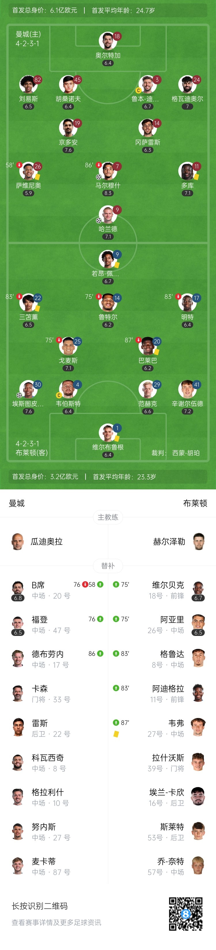 上半场伤停补时4分钟,半场结束,曼城暂2-1布莱顿。