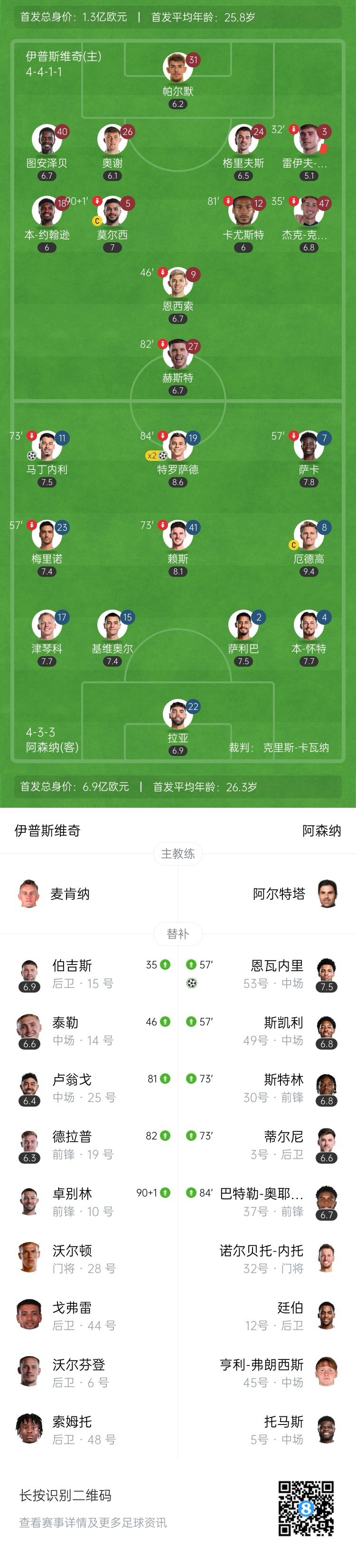 第15分钟,阿森纳取得领先,厄德高带球推进分给萨卡,萨卡传中,厄德高一蹭,特罗萨德推射穿裆破门,阿森纳1-0领先伊普斯维奇。↓