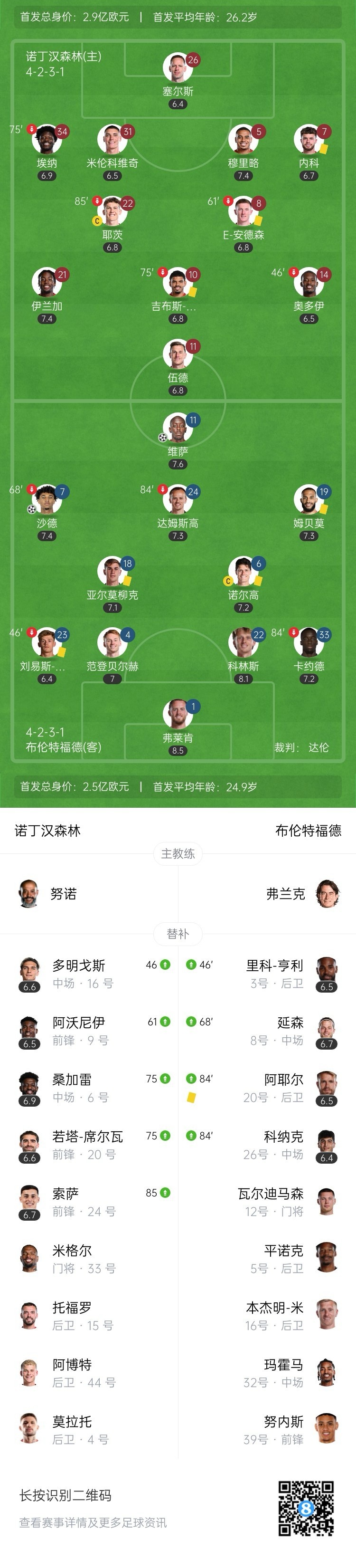 仍居第6+距前四1分!森林0-2布伦特福德4轮遭3负 沙德&维萨破门