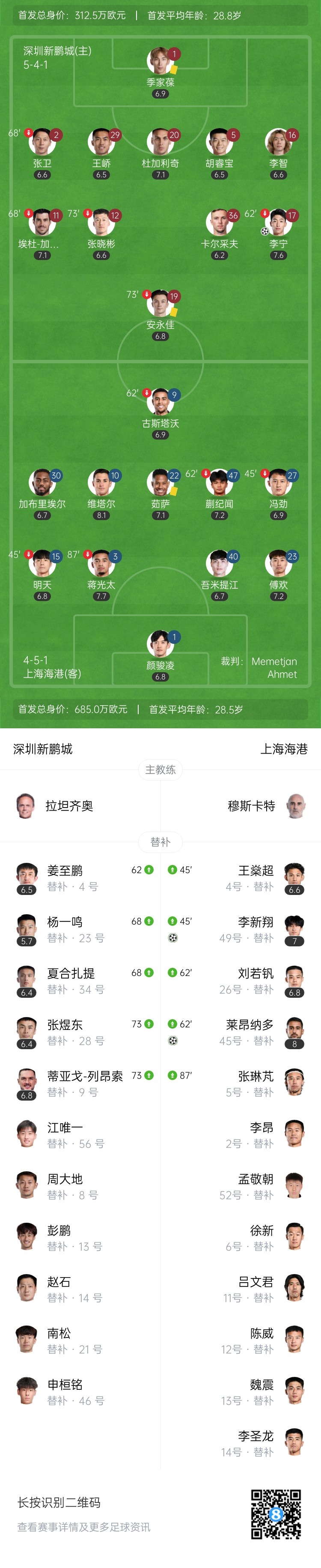 下半场伤停补时5分钟,全场比赛结束,最终上海海港2-1深圳新鹏城。