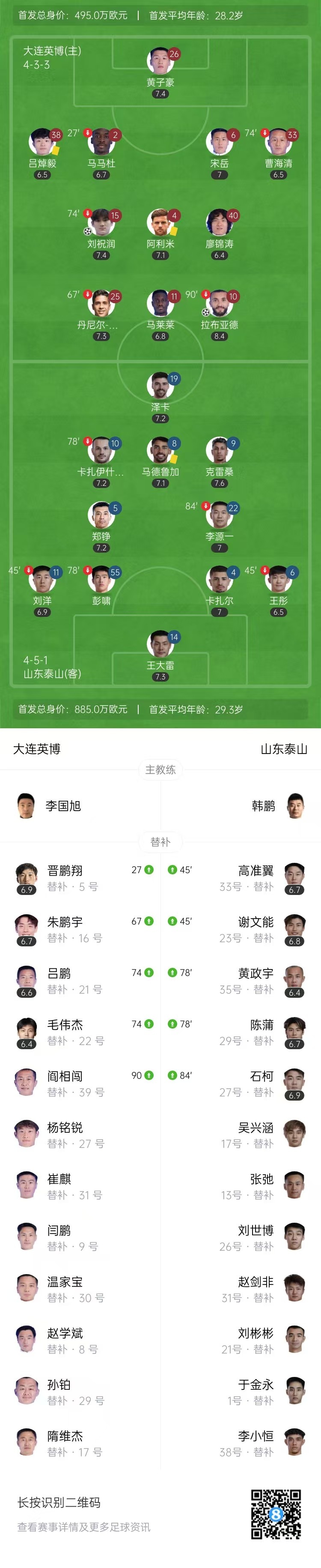 全场比赛结束,大连英博2-0山东泰山。
