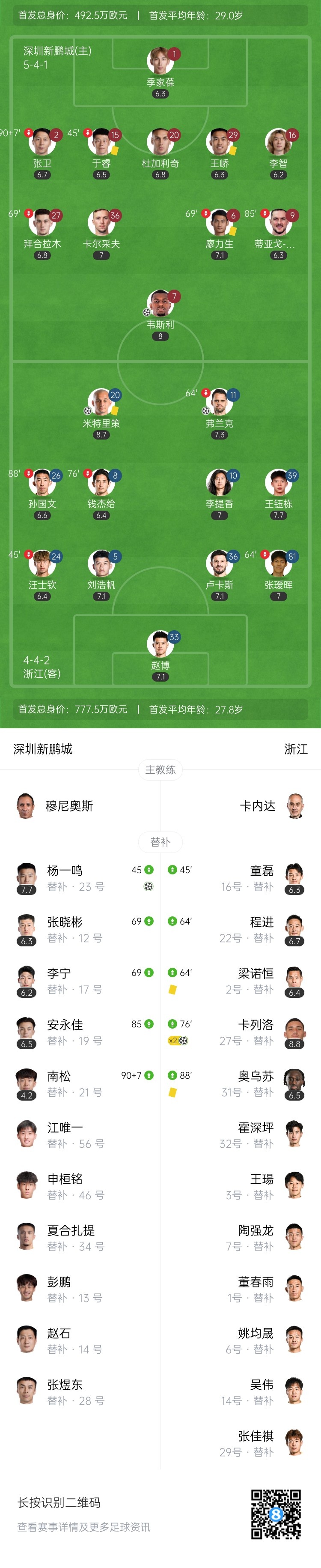 三连胜!浙江4-2深圳 卡列洛双响米特里策传射王钰栋造2球