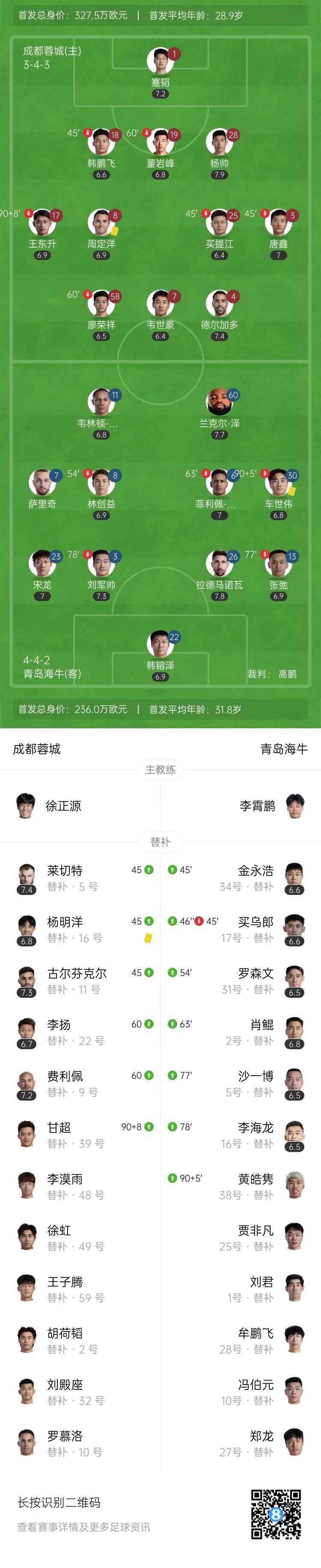 各赛事4连胜终结!成都蓉城0-0青岛海牛 仍居第4&落后榜首3分