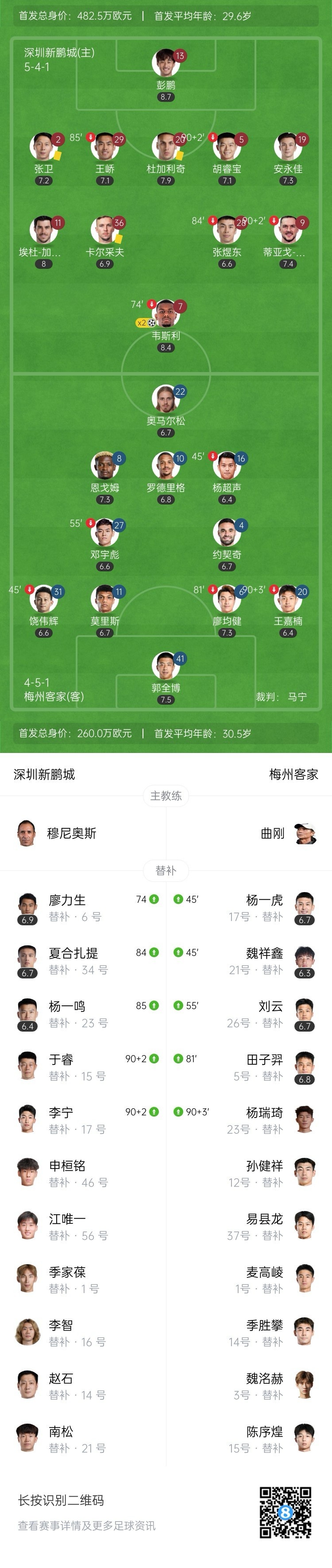 梅州进球被吹出界在先!第44分钟,恩戈姆左路沿底线突破后传中,杨超声包抄抢射破门!通过VAR,主裁马宁吹罚皮球出界在先,进球无效!↓