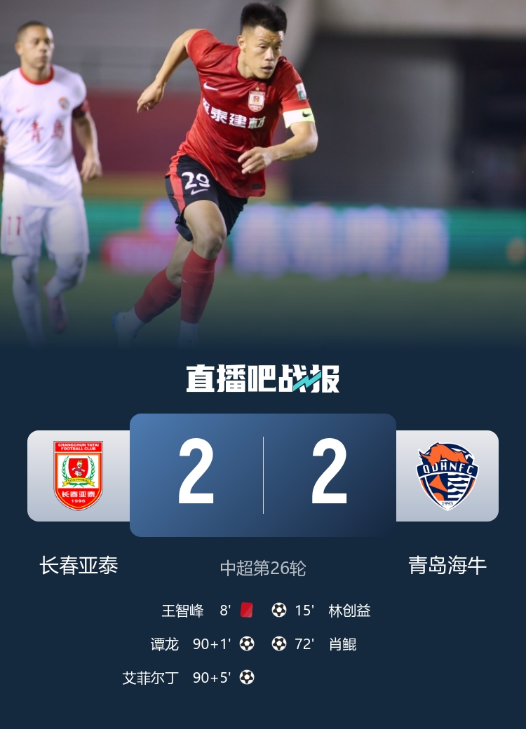第90+5分钟,海牛后场解围失误,亚泰左侧传中到禁区,谭龙头球被扑后艾菲尔丁补射绝平,亚泰2-2海牛↓