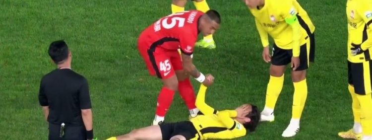 第66分钟,身背黄牌的茹萨无球状态下击中张修维面部,裁判没有出牌。↓