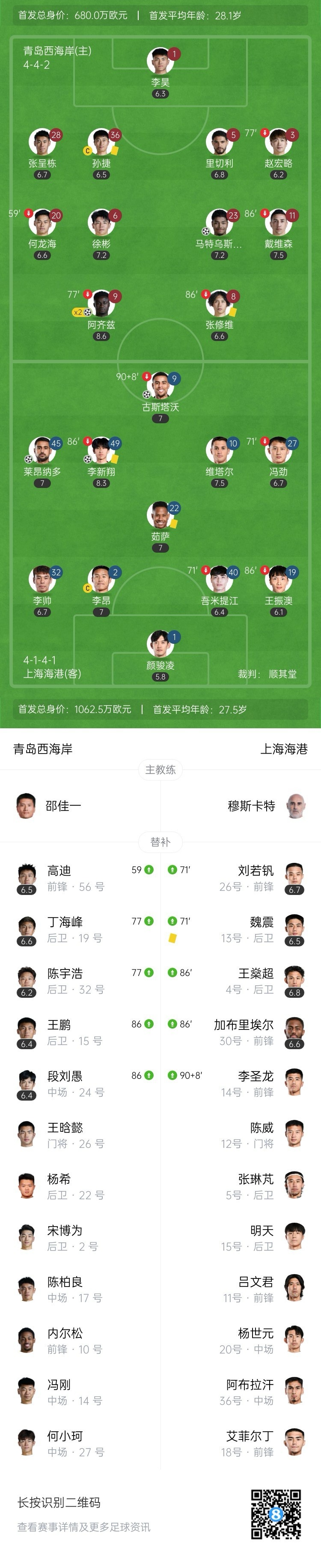 全场比赛结束,上海海港客场3-3战平青岛西海岸。