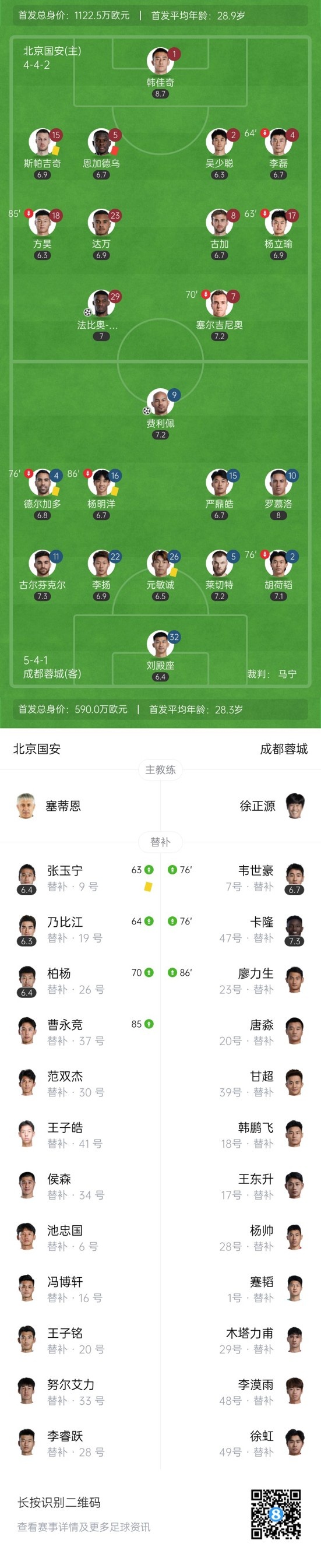 马宁全场1红1点!十人国安1-1蓉城 塞尔吉尼奥首秀韩佳奇9次扑救