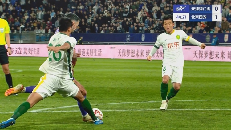 第45分钟,津门虎反击机会,基莱斯右路带球内切,柏杨解围疑似有犯规,VAR介入主裁亲自回看,认定没有点球↓