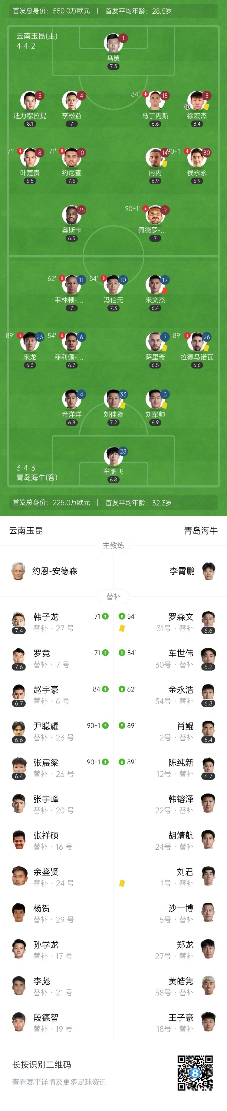 玉昆绝杀!徐宏杰头球破门,韩子龙助攻!第86分钟,韩子龙左路传中落点精准,徐宏杰人群之中抢点头球破门,随后脱衣庆祝染黄,云南玉昆1-0青岛海牛!↓