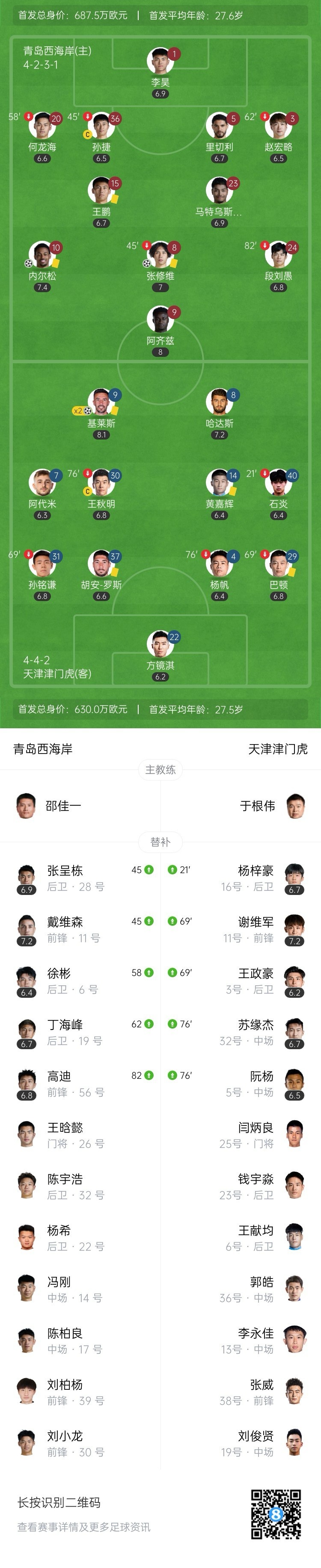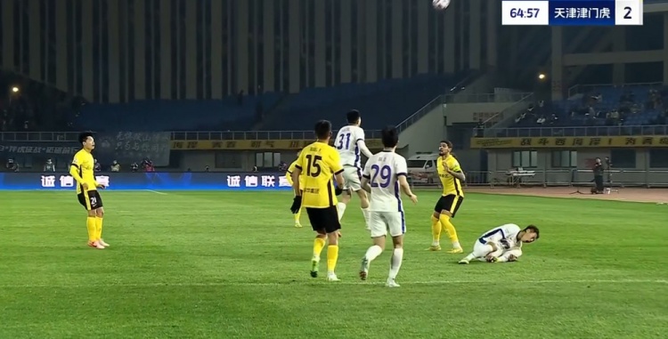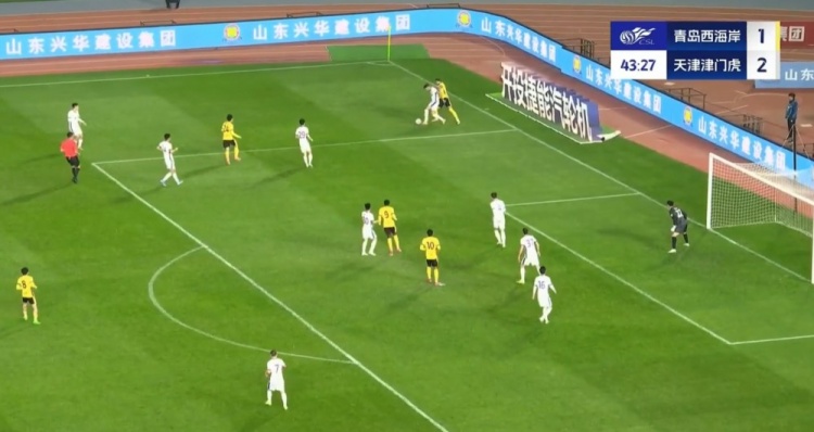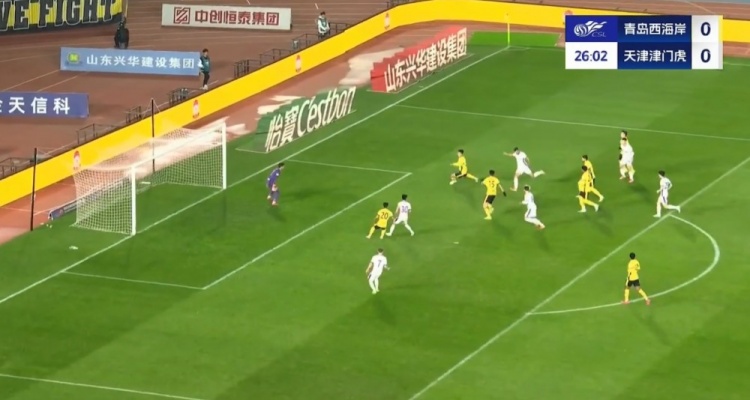 全场比赛结束,天津津门虎客场2-2战平青岛西海岸。