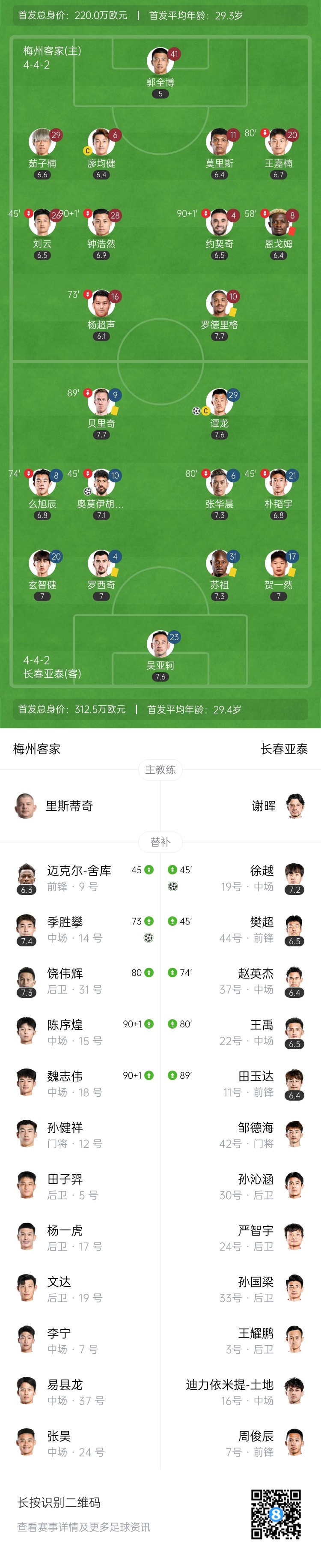 4月11日讯 北京时间4月11日19点35分,梅州客家在主场迎战长春亚泰。上半场,奥莫伊胡安弗单刀破门,苏祖完成一次关键解围,恩戈姆射中门框,谭龙中场吊射得手。下半场,恩戈姆蹬踏吴亚轲被直红罚下,徐越也打进一记超远吊射,季胜攀读秒阶段扳回一球。最终长春亚泰3-1梅州客家取得赛季首胜。本场比赛过后,长春亚泰积4分排在联赛第十三,梅州客家积7分排在联赛第九。
