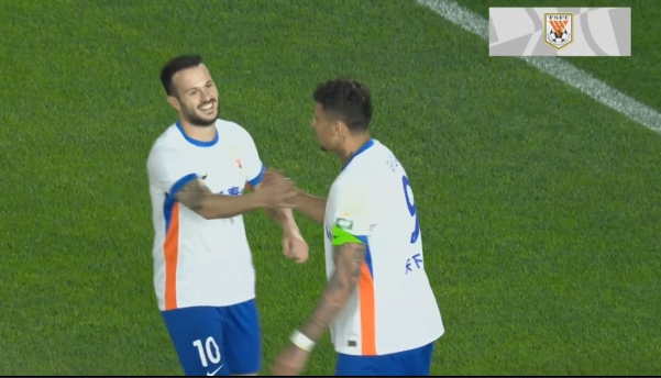 第34分钟,克雷桑禁区内倒地,裁判第一时间没有判罚,经VAR介入后最终判罚点球!克雷桑主罚骗过门将稳稳推进!1-0!山东泰山改写了比分!↓