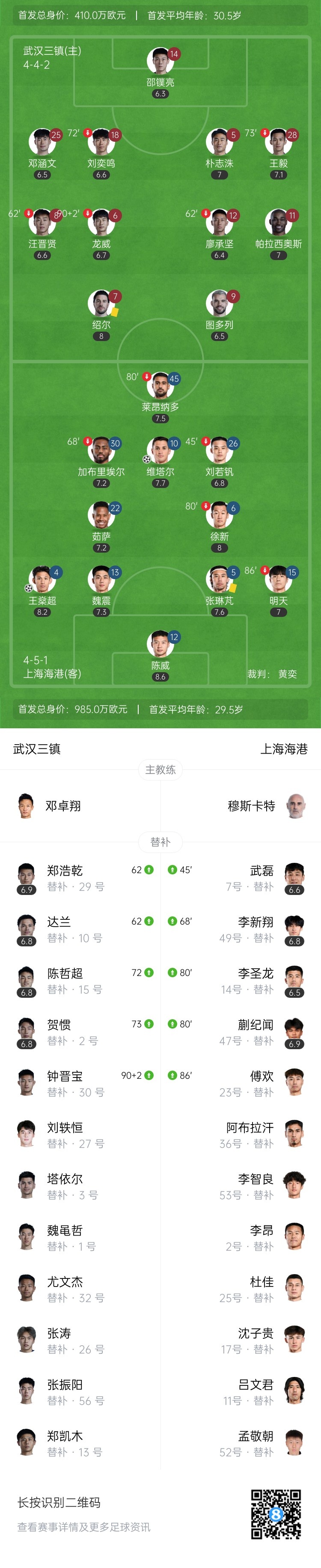 下半场伤停补时6分钟,全场比赛结束,最终武汉三镇0-2上海海港。