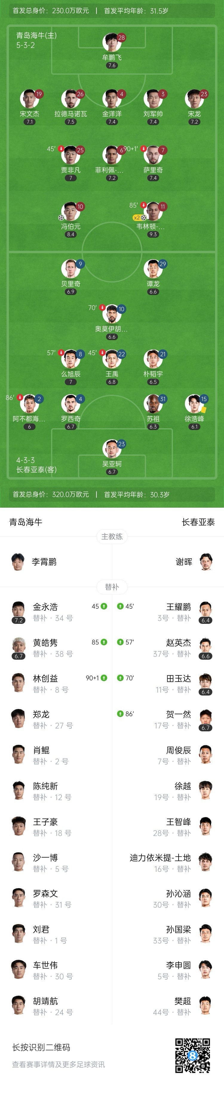全场比赛结束,青岛海牛3-0击败长春亚泰。