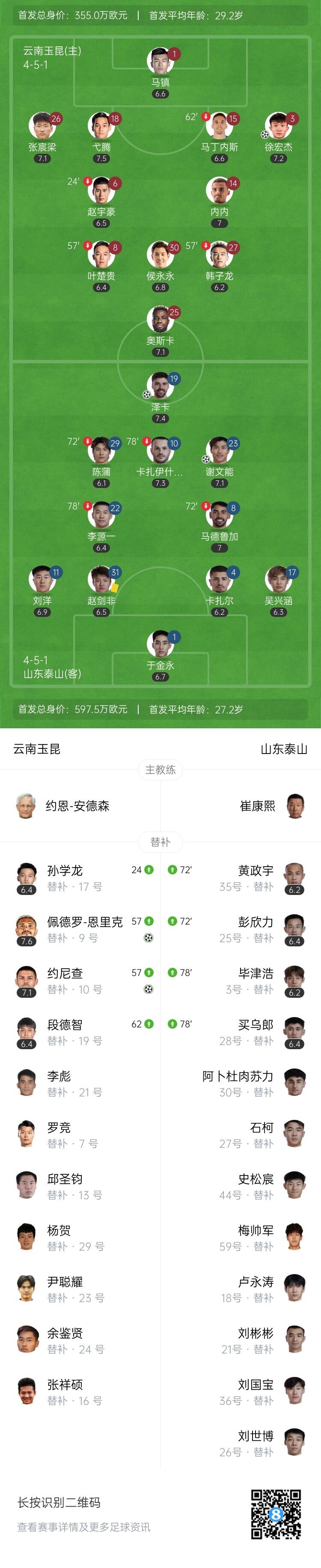 5月5日讯 北京时间5月5日晚上20:00,中超第11轮,云南玉昆坐镇玉溪高原体育中心迎战山东泰山。上半场,谢文能贴地斩,赵宇豪伤退,弋腾门线救险,泽卡远射得手。下半场,陈蒲失单刀,恩里克、约尼查替补建功,徐宏杰世界波反超。