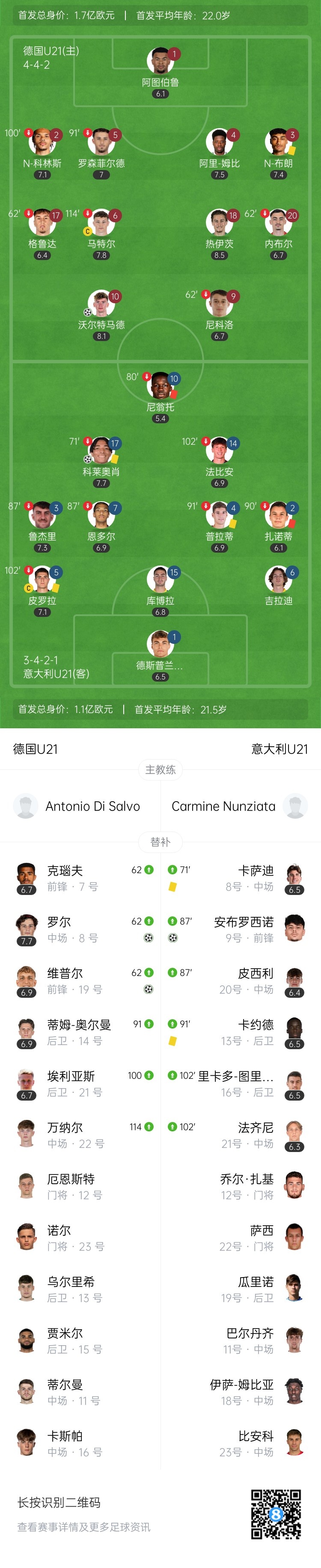 6月23日讯 欧青赛1/4决赛,德国U21对阵意大利U21。上半场,双方互有攻防均无建树。易边再战场面风云突变,科莱奥肖为意大利先拔头筹,沃尔特马德、维普尔破门反超比分,尼翁托、扎诺蒂接连两黄变红被罚下,安布罗西诺第96分钟任意球绝平,双方进入加时赛。加时赛第117分钟罗尔远射绝杀,最终德国U21队3-2意大利U21晋级半决赛,将对阵法国U21。