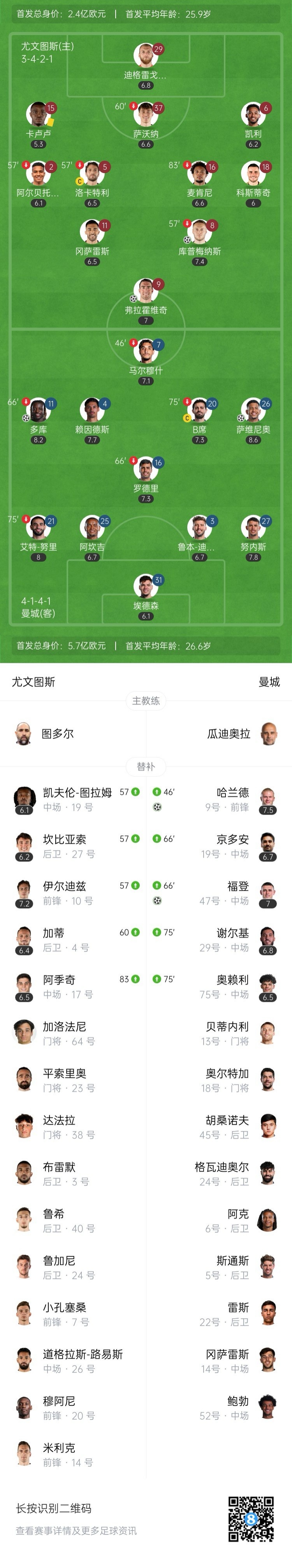 弗拉霍维奇扳回一城,伊尔迪兹助攻!第84分钟,伊尔迪兹摆脱后精妙直塞,弗拉霍维奇单刀推射破门,尤文图斯2-5曼城!↓