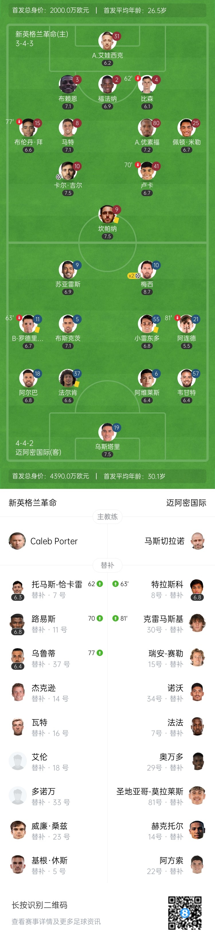 梅西连场双响&近5轮9球4助!迈阿密国际2-1新英格兰革命联赛4连胜