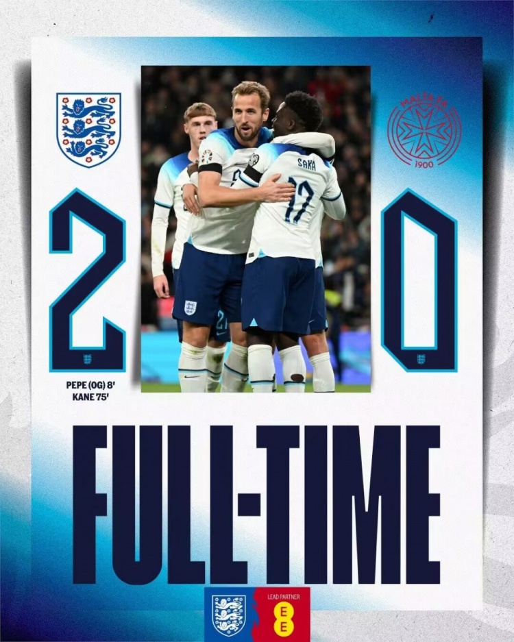 11月18日讯 欧洲杯预选赛第9轮,英格兰主场迎战马耳他。上半场,福登的传中被佩佩挡了一下自摆乌龙,凯恩禁区内摔倒被吹假摔染黄。易边再战,凯恩破门,赖斯远射蹭到越位的凯恩被吹。最终英格兰2-0马耳他。积分榜方面,提前出线的英格兰积19分继续领跑,马耳他8场0分仍垫底。