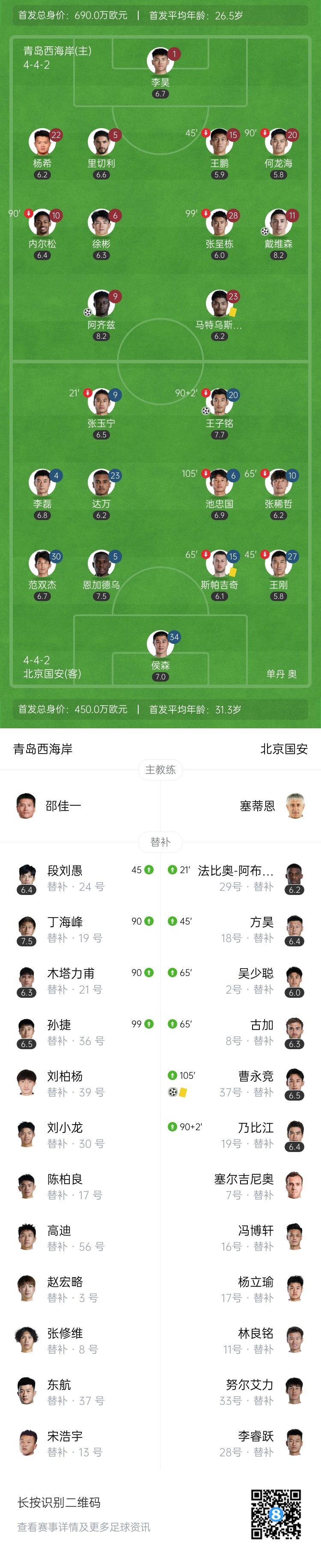 第62分钟,段刘愚前插杀到禁区内左侧,左脚横扫门前,被门将扑了一下,随后阿齐兹跟进破门!主裁判罚越位!随后VAR确认进球有效!青岛西海岸1-1扳平北京国安↓