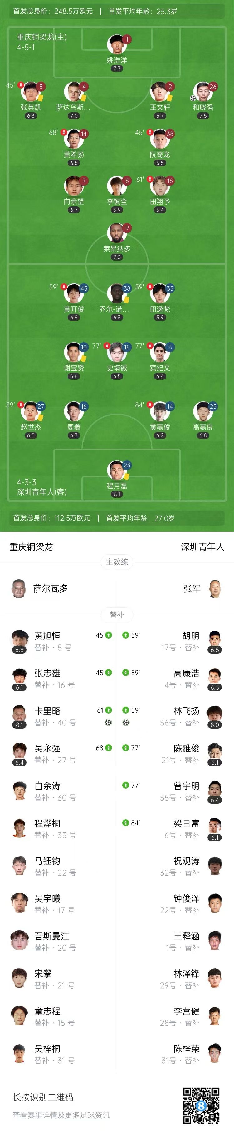 7月26日讯 北京时间7月26日19:30,中甲第18轮,重庆铜梁龙坐镇主场铜梁龙体育场迎战深圳青年人。上半场,诺贝尔破门但冲撞门将在先,姚浩洋近距离神扑,田逸梵反击打门中柱。下半场,诺贝尔反击错失良机,莱昂纳多助攻和晓强打破僵局,林飞扬反击扳平比分,补时阶段林飞扬错失单刀绝杀机会,卡里略反击推射绝杀。最终,重庆铜梁龙主场2-1绝杀深圳青年人,积分榜上落后榜首3分,位居次席。