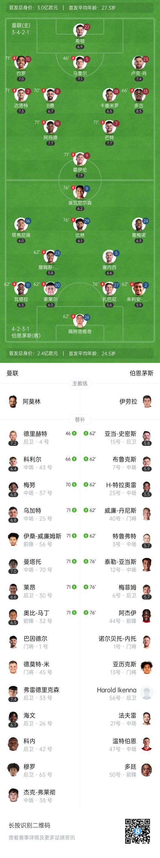 第53分钟,曼联再下一城!霍伊伦禁区背身拿球转身被防守球员拦截,第二点阿玛德推射破门,曼联3-0伯恩茅斯。↓