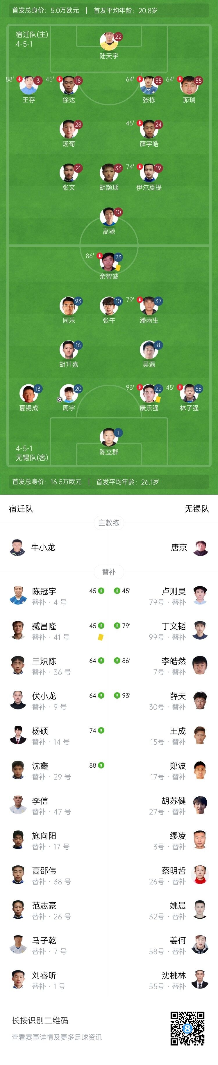 伤停补时5分钟。全场比赛结束,宿迁0-1无锡。
