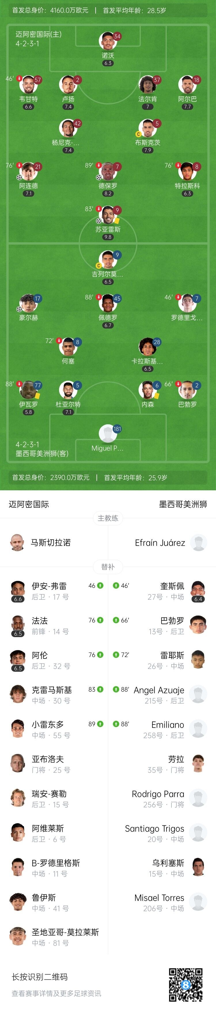 伤停补时3分钟。全场比赛结束,迈阿密国际3-1墨西哥美洲狮。
