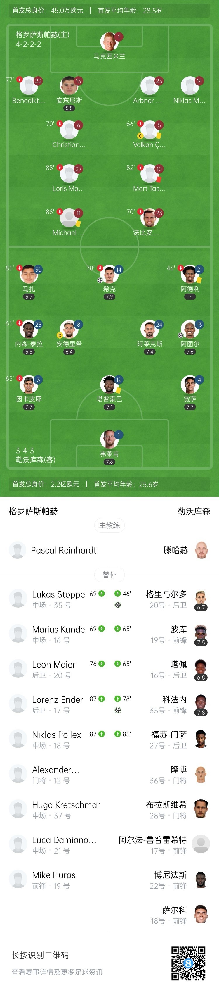 药厂多打1人!第66分钟,格罗萨斯帕赫队长沃尔坎两黄变一红被罚出场!↓