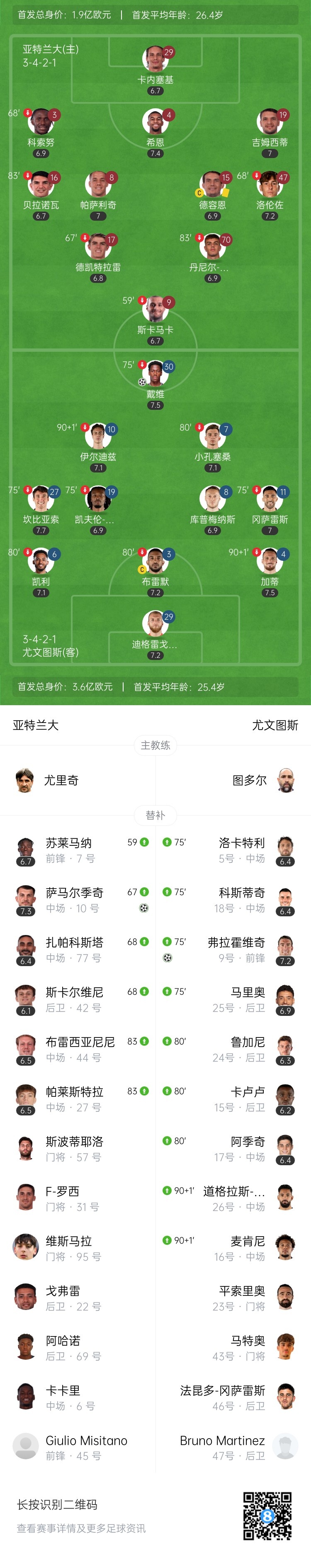 第90分钟,萨马尔季奇禁区前接球,闪身杀进禁区,假射再过一人,面对迪格雷戈里奥将球打进!亚特兰大扳回一球,1-1尤文↓