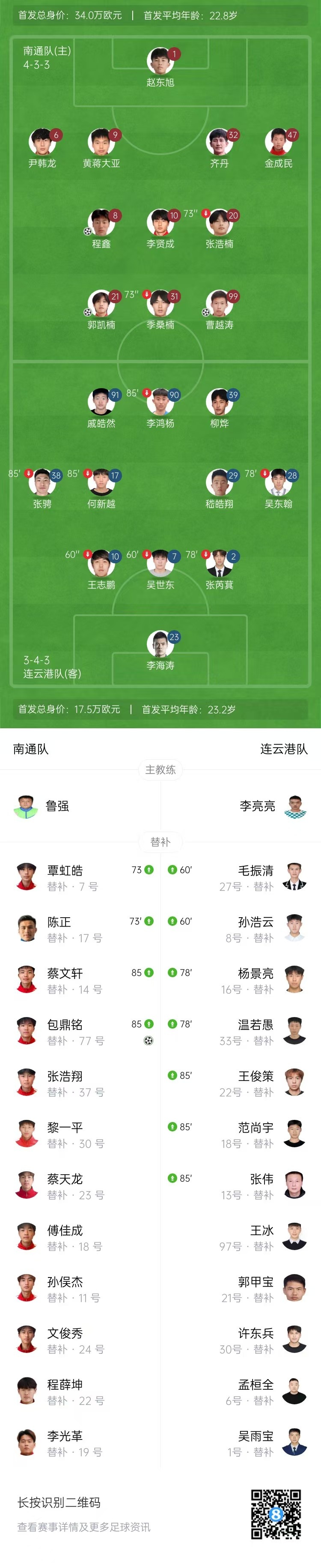 第90+2分钟,覃虹皓右路送出传中,包鼎铭门前头球轻松顶进,南通5-0连云港。↓
