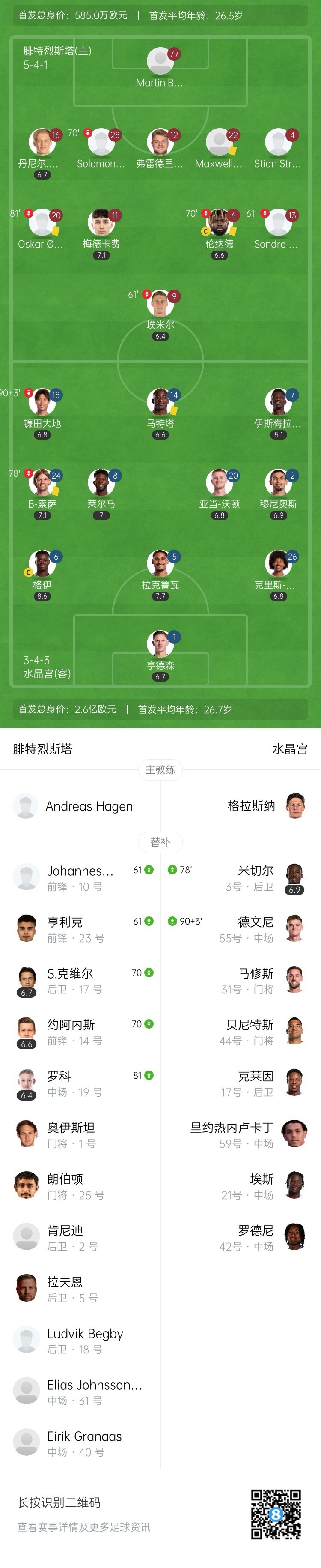 全场比赛结束,水晶宫客场0-0战平腓特烈斯塔。