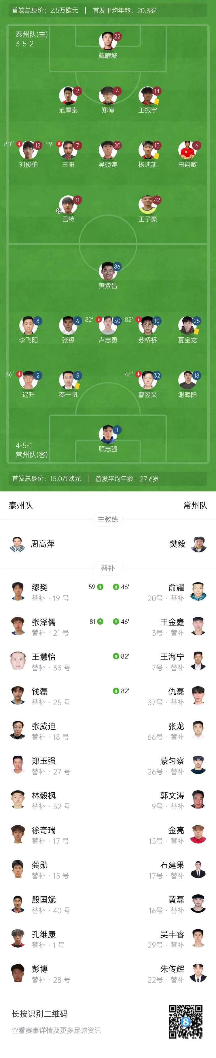 苏超-常州1-1客场平泰州2轮不败 巴特破门黄紫昌首秀造点+点射