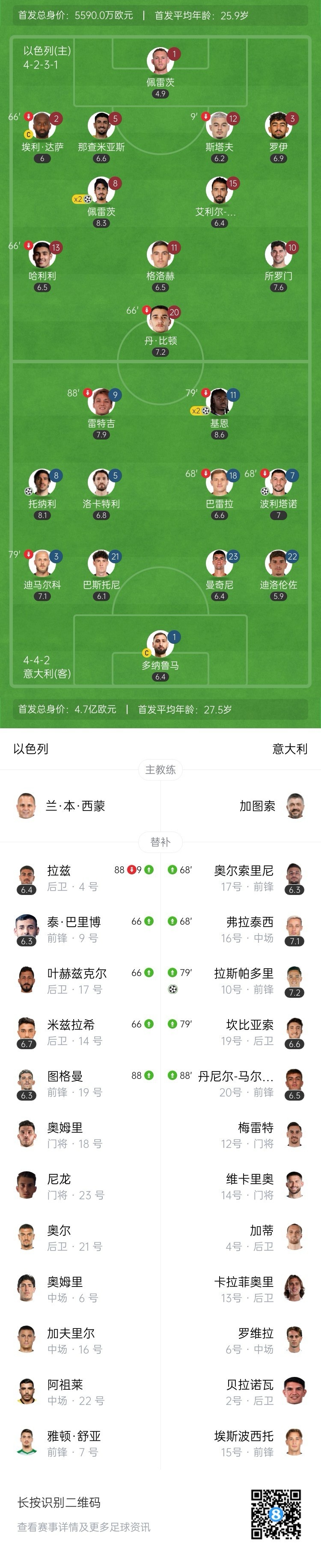 全场比赛结束,意大利5-4以色列。