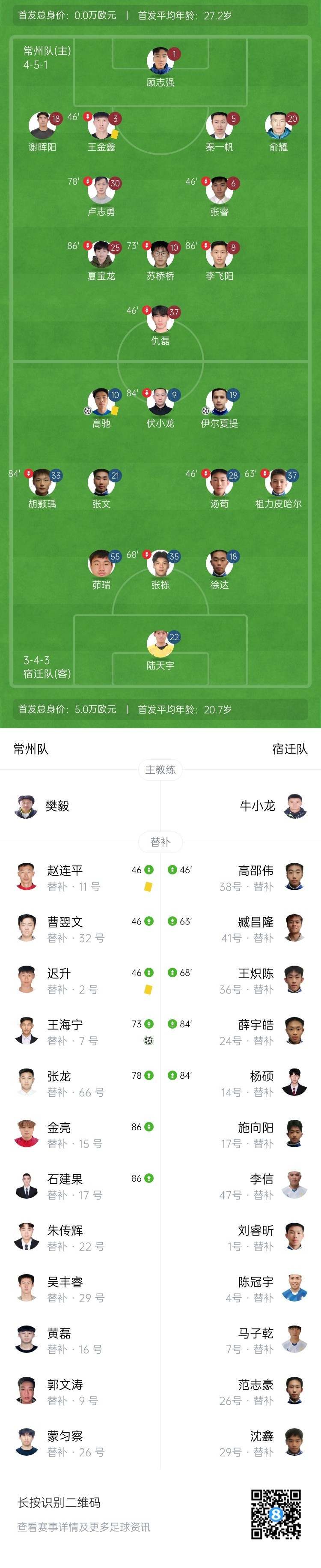第42分钟,客场作战的宿迁队取得领先,伊尔夏提接右路传中,力压防守球员头球顶进死角,宿迁队1-0领先常州队。↓