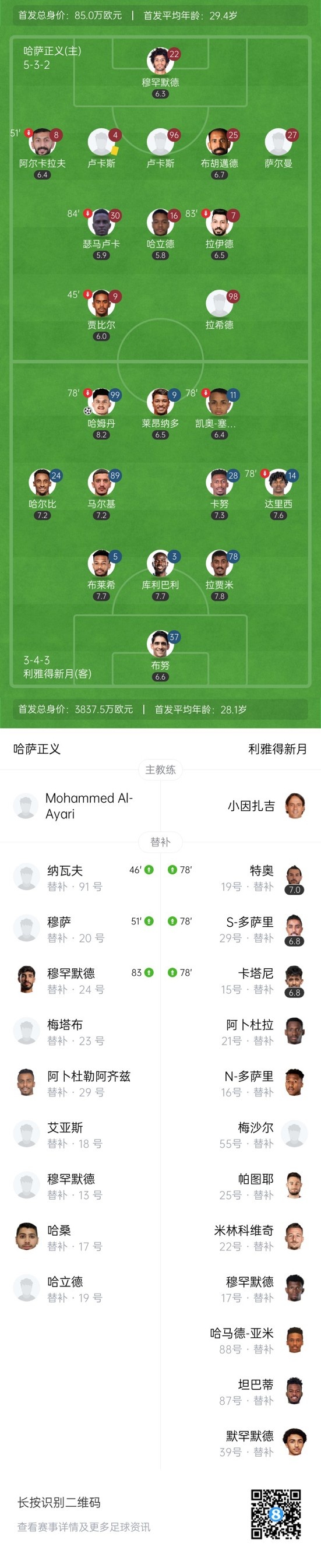 下半场补时4分钟,哈萨正义0-1利雅得新月。
