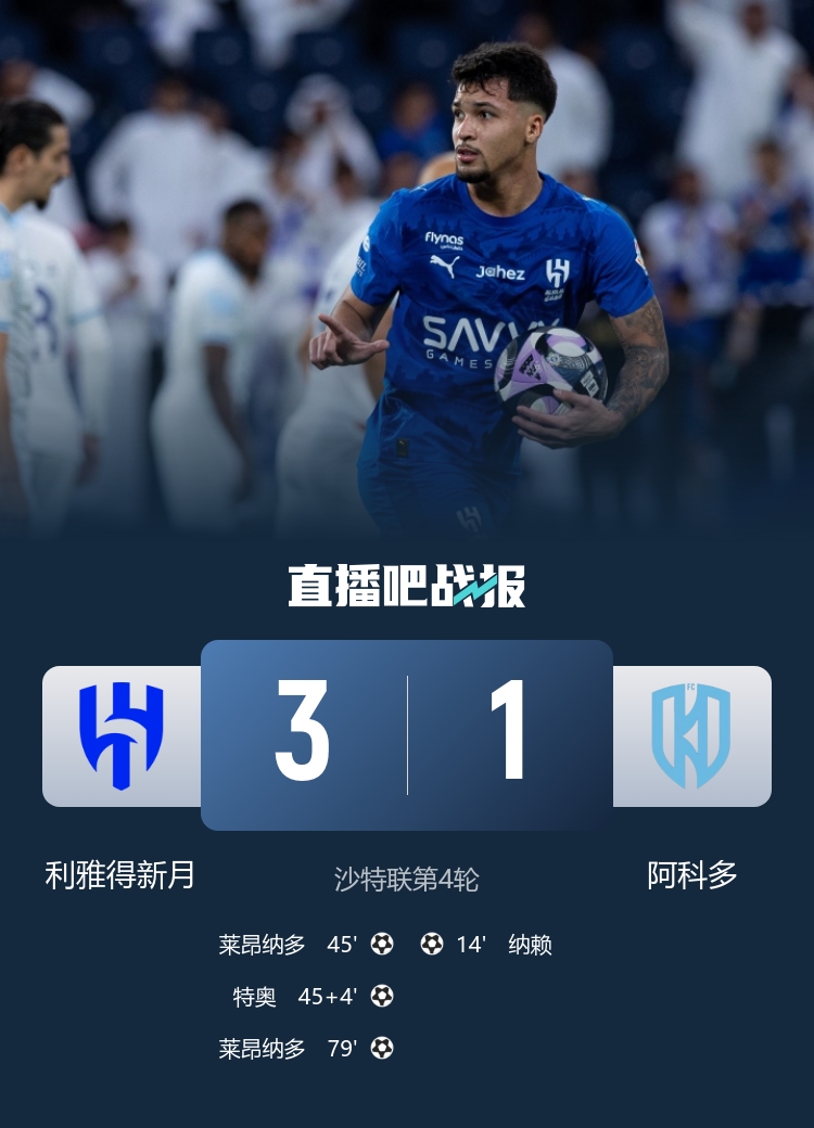 新月2球领先!莱昂纳多补射双响!第79分钟,新月的角球开出,米林科维奇头球攻门被塞缪尔扑出,莱昂纳多补射得分,利雅得新月3-1阿科多!↓