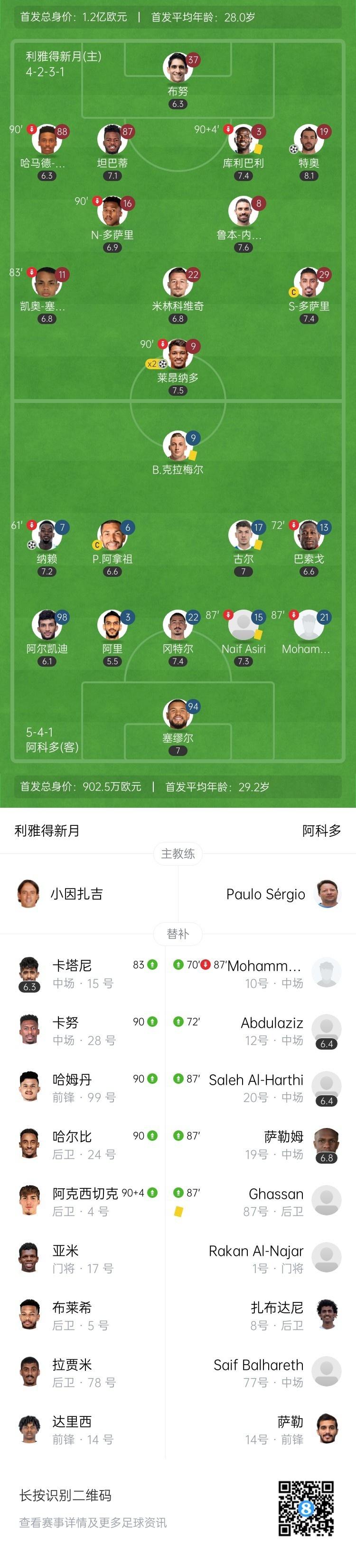 全场比赛结束,利雅得新月主场3-1逆转阿科多。