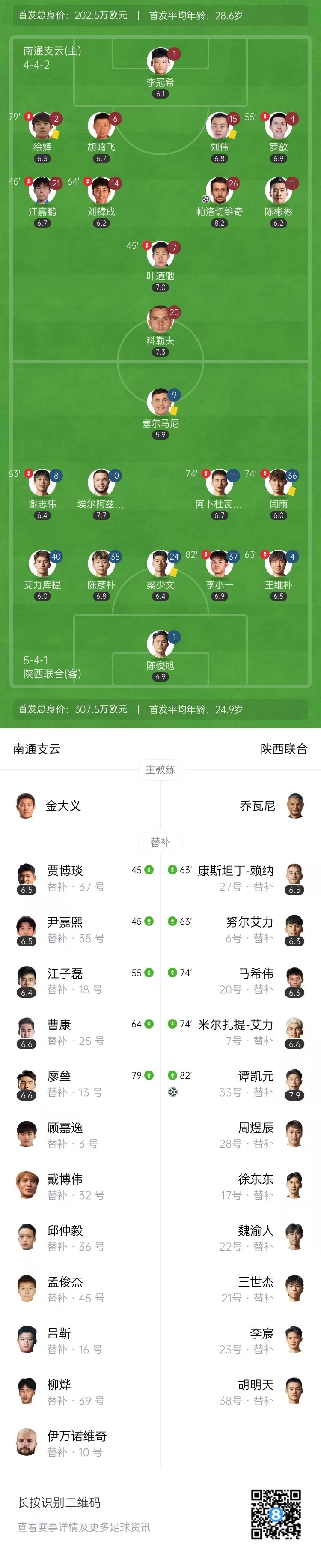 第83分钟,陕西联合左侧角球开出,谭凯元后点头球扳平比分,陕西联合1-1南通支云。↓