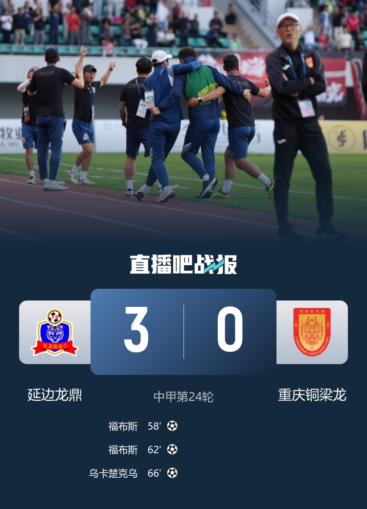 9月27日讯 北京时间9月27日15点,中甲第24轮,延边龙鼎在主场延吉市全民健身体育中心体育场迎战重庆铜梁龙。上半场,两队都没有打出有威胁的进攻。下半场,福布斯4分钟梅开二度,乌卡楚克乌再进一球。最终延边龙鼎3-0击败重庆铜梁龙。本场比赛过后,重庆铜梁龙在先赛的情况下积46分,暂时还是排在联赛第二,延边龙鼎积42分,暂时排在联赛第四。