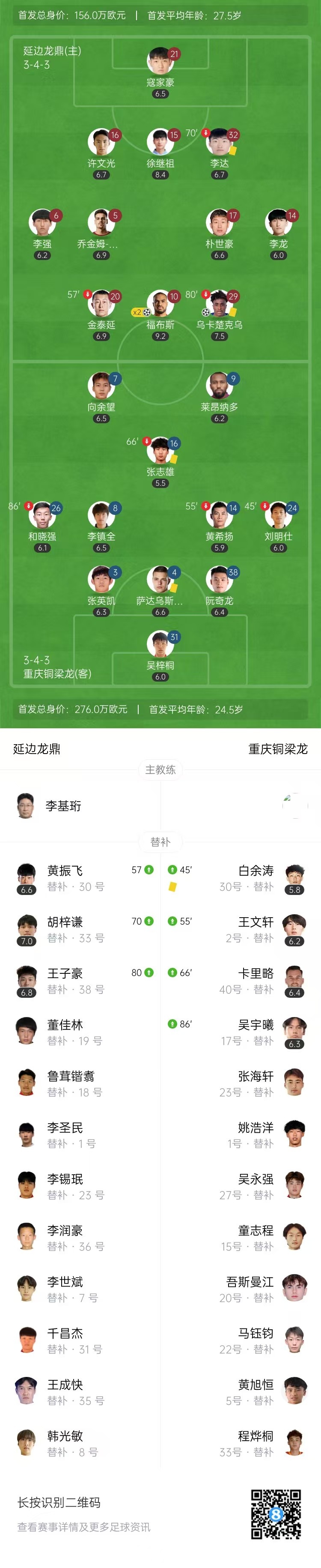全场比赛结束,延边龙鼎3-0重庆铜梁龙。