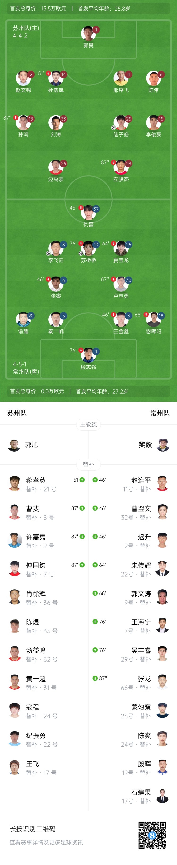 9月27日讯 北京时间19:35,苏超第13轮苏州队vs常州队。上半场,苏桥桥帮助常州队取得领先;陆子皓破门扳平比分。随后苏州队获得点球,孙鸿点射反超!下半场,常州队绝平!苏州队94分钟绝杀!最终,苏州队近6轮首胜,第10名收官无缘淘汰赛;常州队位列第12。