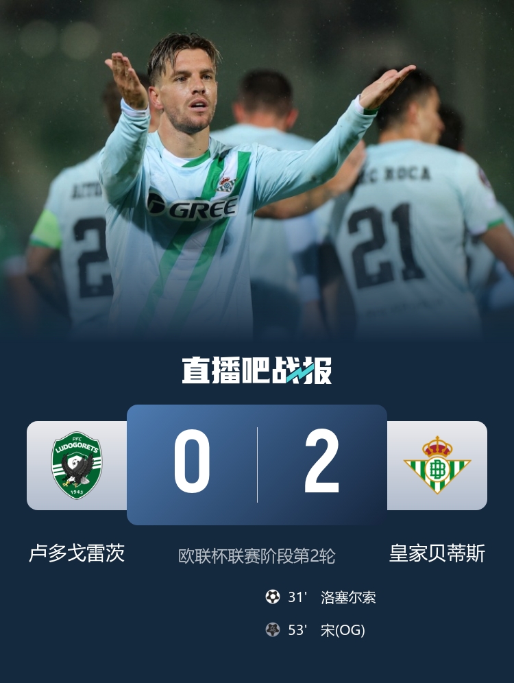 贝蒂斯2-0卢多戈雷茨 安东尼轮休未登场洛塞尔索破门菲尔波造乌龙