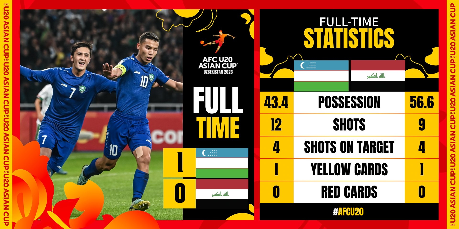 乌兹别克斯坦U20:21-奥塔别克、6-亚孔吉尔、3-阿卜杜科迪尔、15-迪奥贝克、20-马赫穆琼(90' 4-阿布巴克尔)、10-乌马拉里、8-别克鲁兹(90' 18-赛达夫扎尔洪)、13-扎法穆罗德(82' 2-伊扎迪约)、14-阿博斯贝克、22-谢尔佐德(61' 17-诺迪尔)、23-尤拉波耶夫(61' 7-普拉特克萨贾)