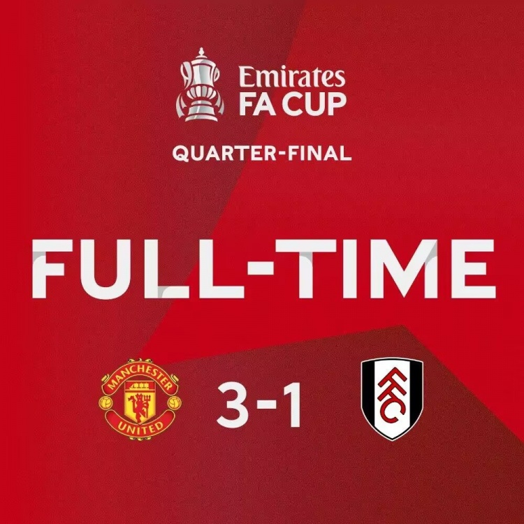 3月20日讯 北京时间3月20日凌晨00:30,足总杯1/4决赛在老特拉福德球场展开角逐,曼联坐镇主场迎战富勒姆。上半场,双方互有攻守,但是没能改写比分,上半场比赛结束,曼联0-0富勒姆,下半场,米特洛维奇利用角球率先破门,威廉和米特洛维奇被双双红牌罚下,B费点射,萨比策破门反超比分,B费终场前完成梅开二度,最终全场比赛结束,曼联3-1淘汰富勒姆,晋级足总杯四强,半决赛将会对阵布莱顿。