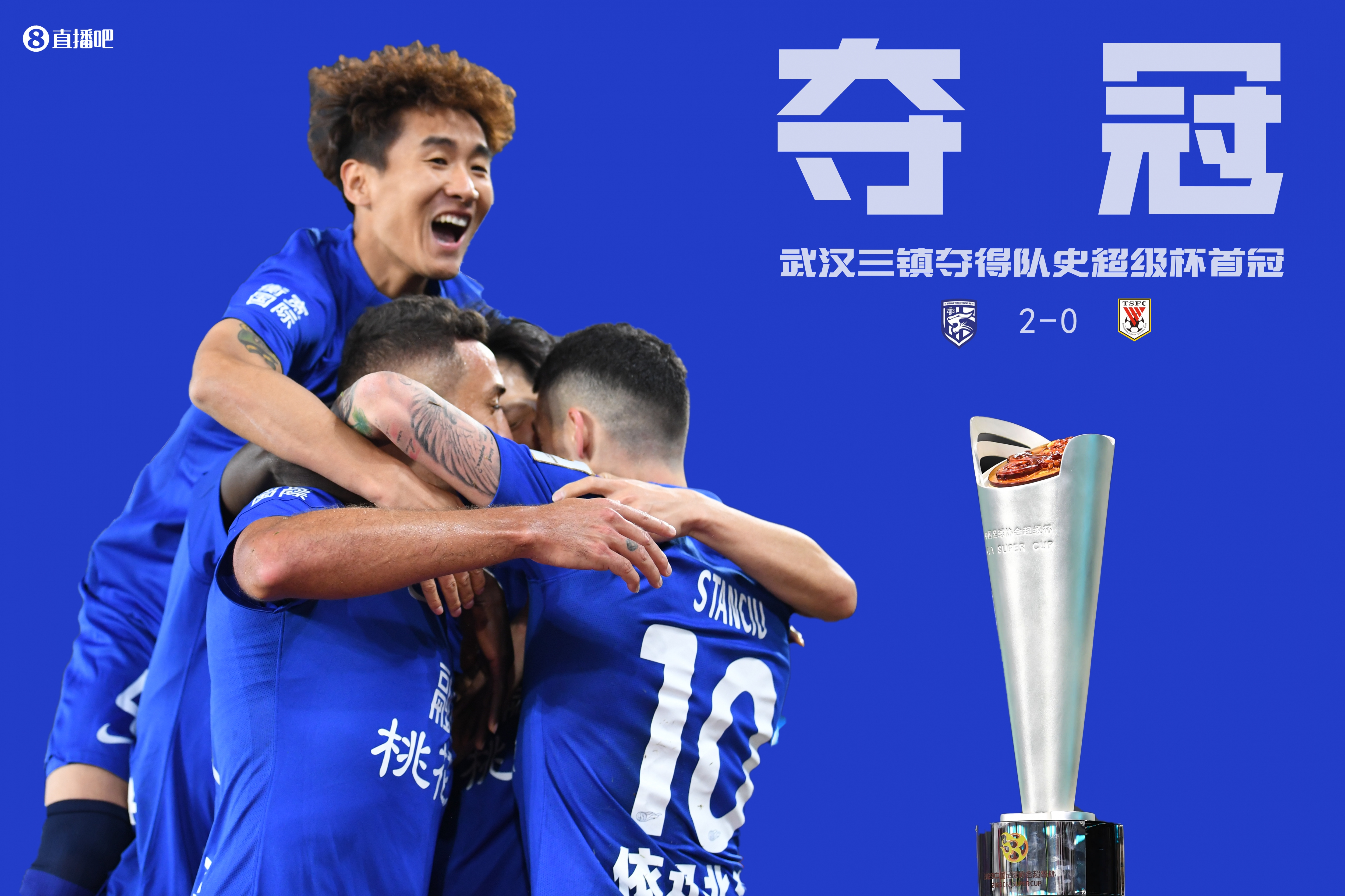 直播4月8日讯 北京时间4月8日下午19:35,中国足协超级杯,武汉三镇对阵山东泰山。上半场,韦世豪助攻,阿齐兹头球冲顶得手。下半场,谢鹏飞扩大领先优势,刘殿座神扑后出现超级失误险丢球,孙准浩直红。全场结束,武汉三镇2-0山东泰山,队史首次夺得超级杯冠军。