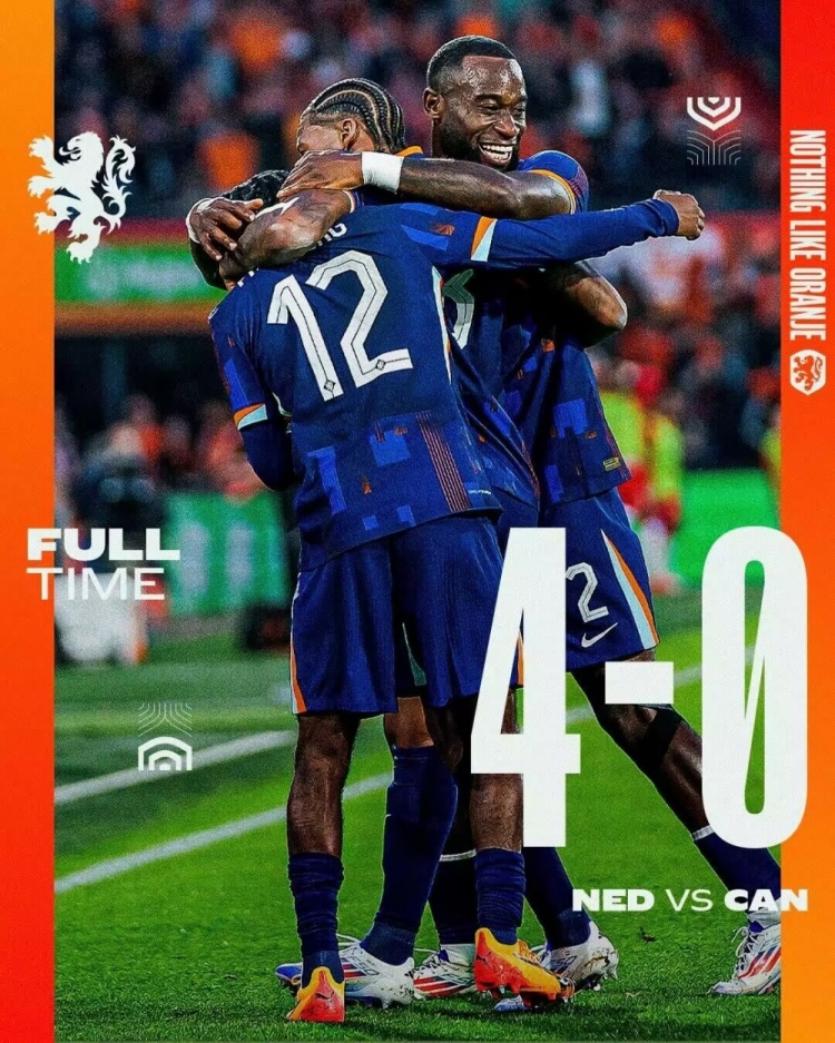 6月7日讯 北京时间6月7日凌晨2时45分,荷兰与加拿大进行一场热身赛。上半场双方均无建树。荷兰半场0-0战平加拿大。下半场,弗林蓬助攻德佩首开纪录,随后弗林蓬、韦霍斯特、范迪克相继破门,最终荷兰队4-0击败加拿大。